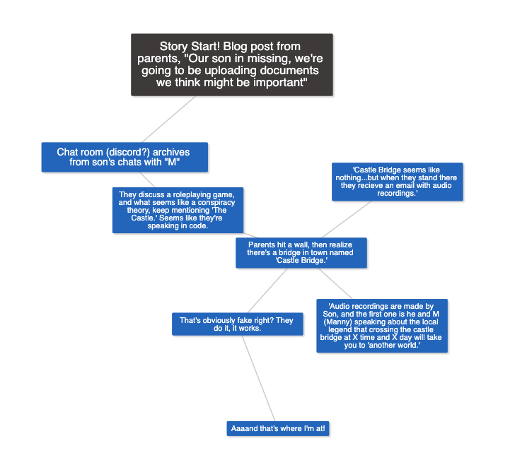 I think despite these similarities and differences, my project fits into a tradition of blending narrative and gameplay, and seeking to experiment with how the two can overlap. Digital Networked Narratives naturally foster this due to their inclination towards audience interactivity, and my pieces does add something new in this regard. It’s an original, if not overly inspired story that causes the reader to question how gameplay and story can be used to enrich the audience’ experience.